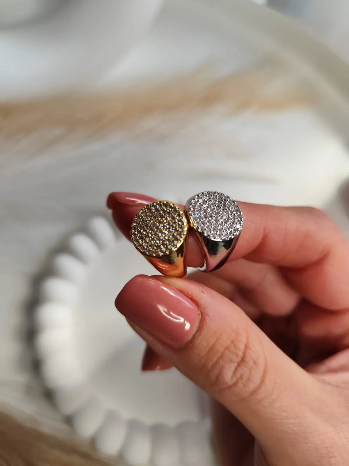 Anello Chevalier tondo realizzato con pavè di pietre zirconi bianchi.