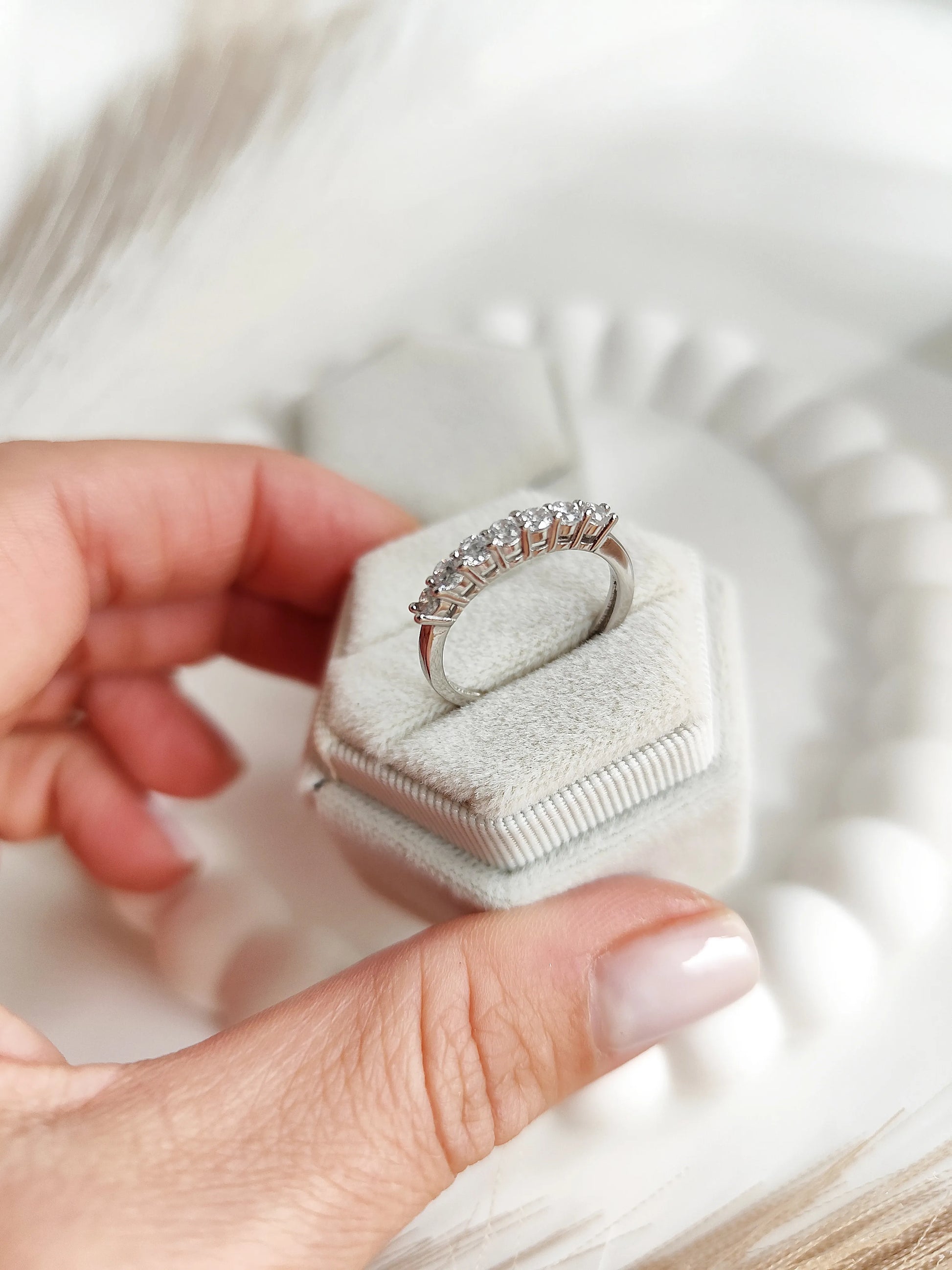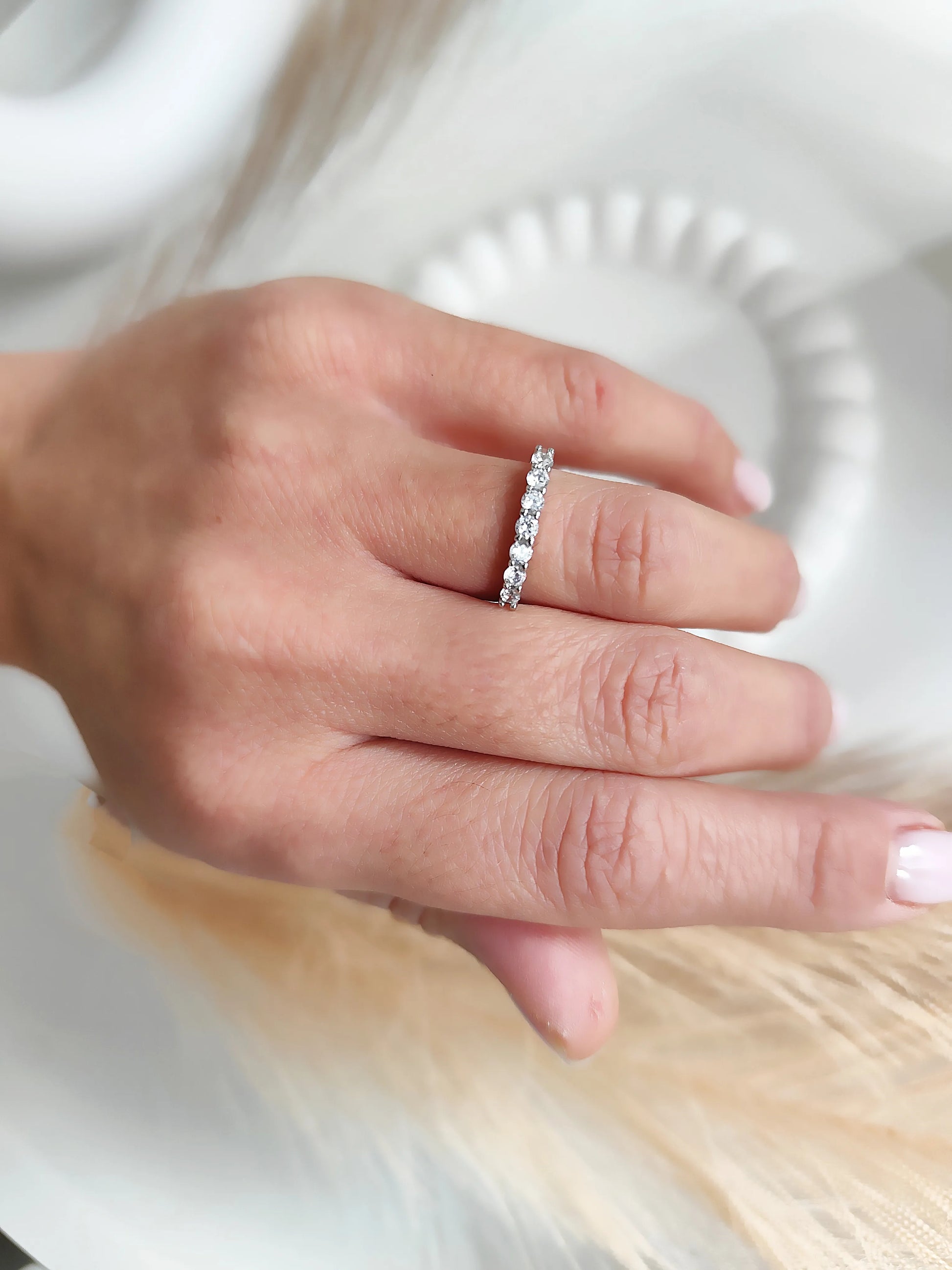 L' anello mezza veretta è realizzato da un mezzo giro di pietre zirconi bianche.