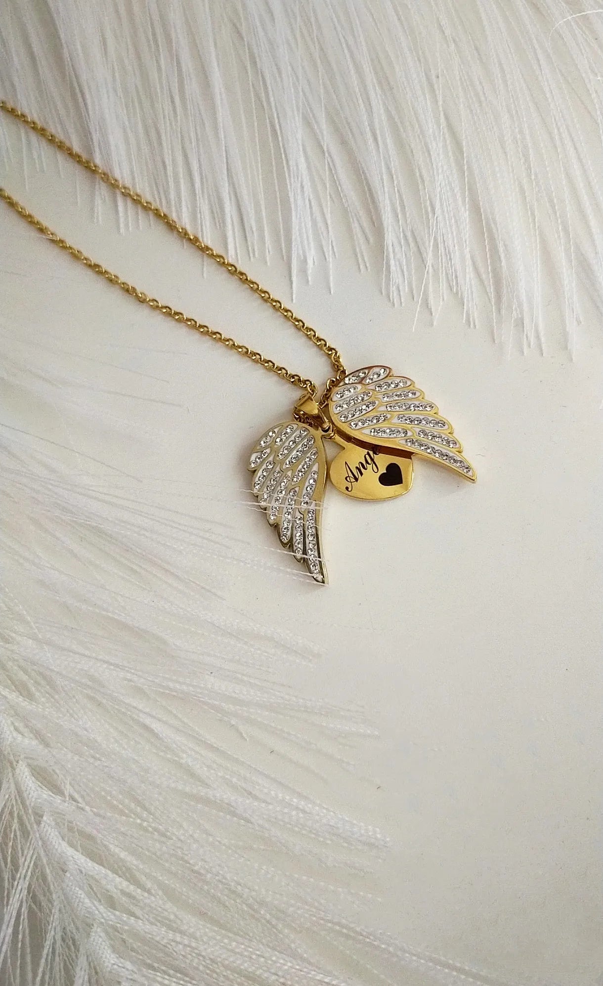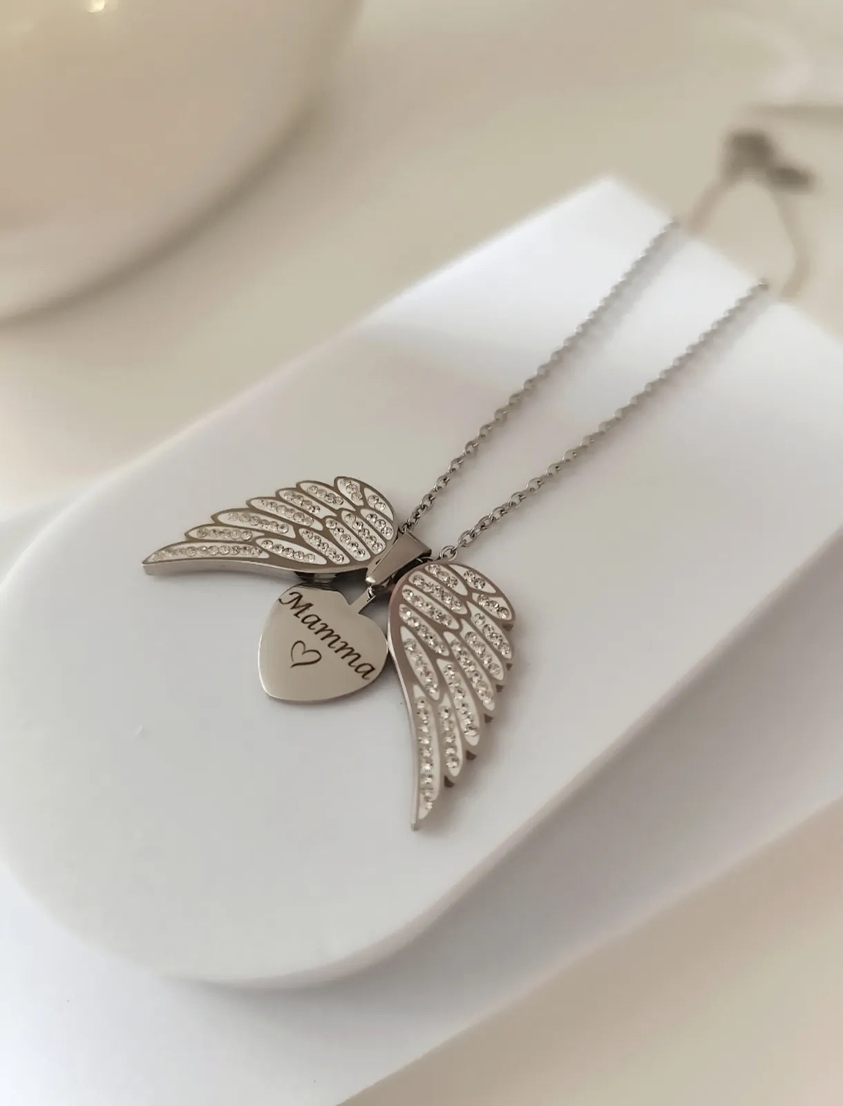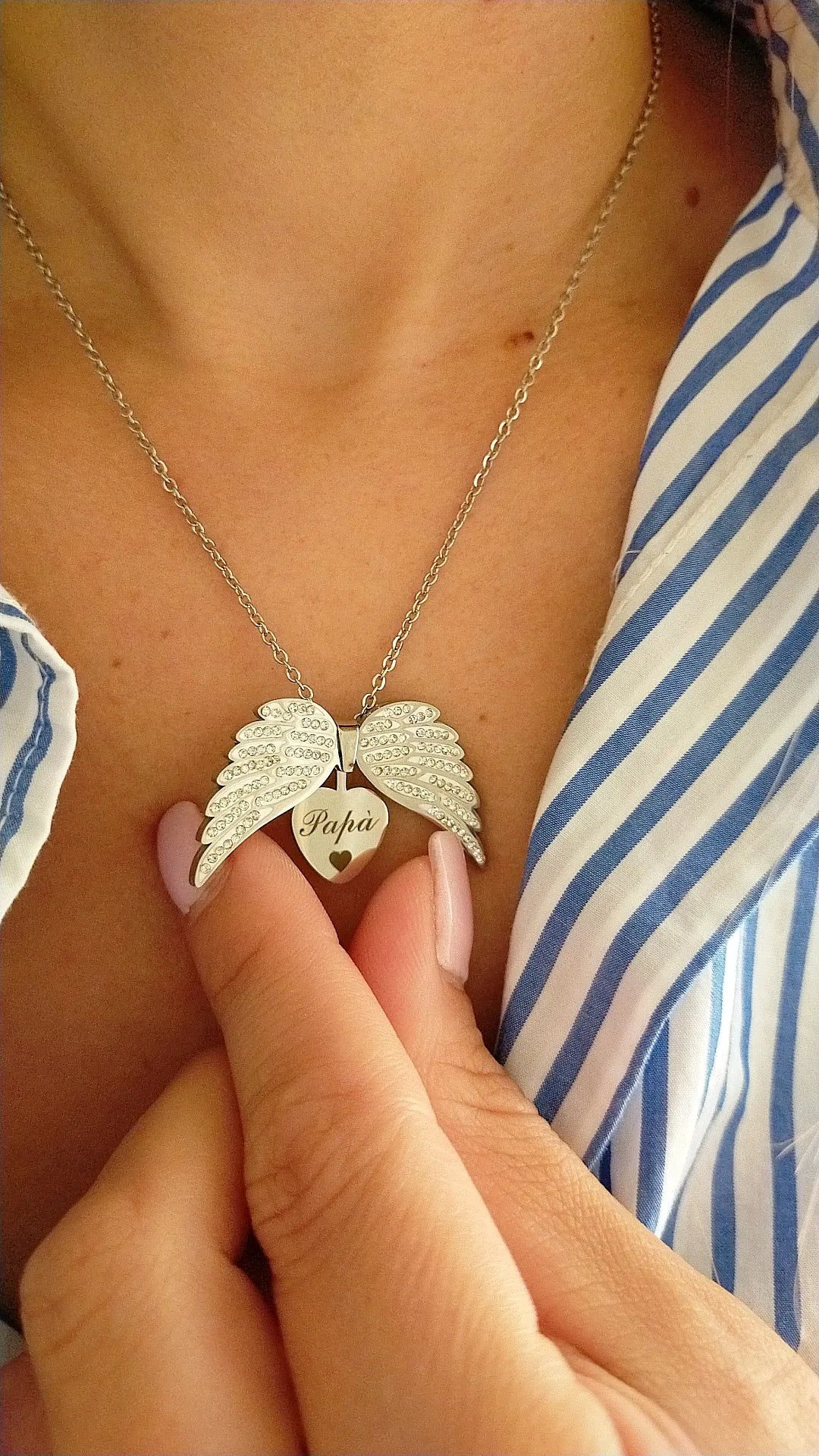 La collana è realizzata in acciaio inossidabile, la ali si aprono e troverete un cuore dove è possibile realizzare un’ incisione personalizzata.
