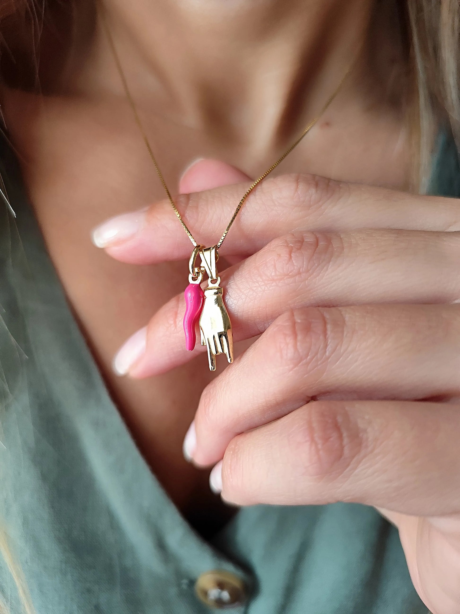 La collana Fortunella è realizzata con due ciondoli portafortuna, il cornetto smaltato e le corna, i simboli per eccellenza contro la "sfortuna".