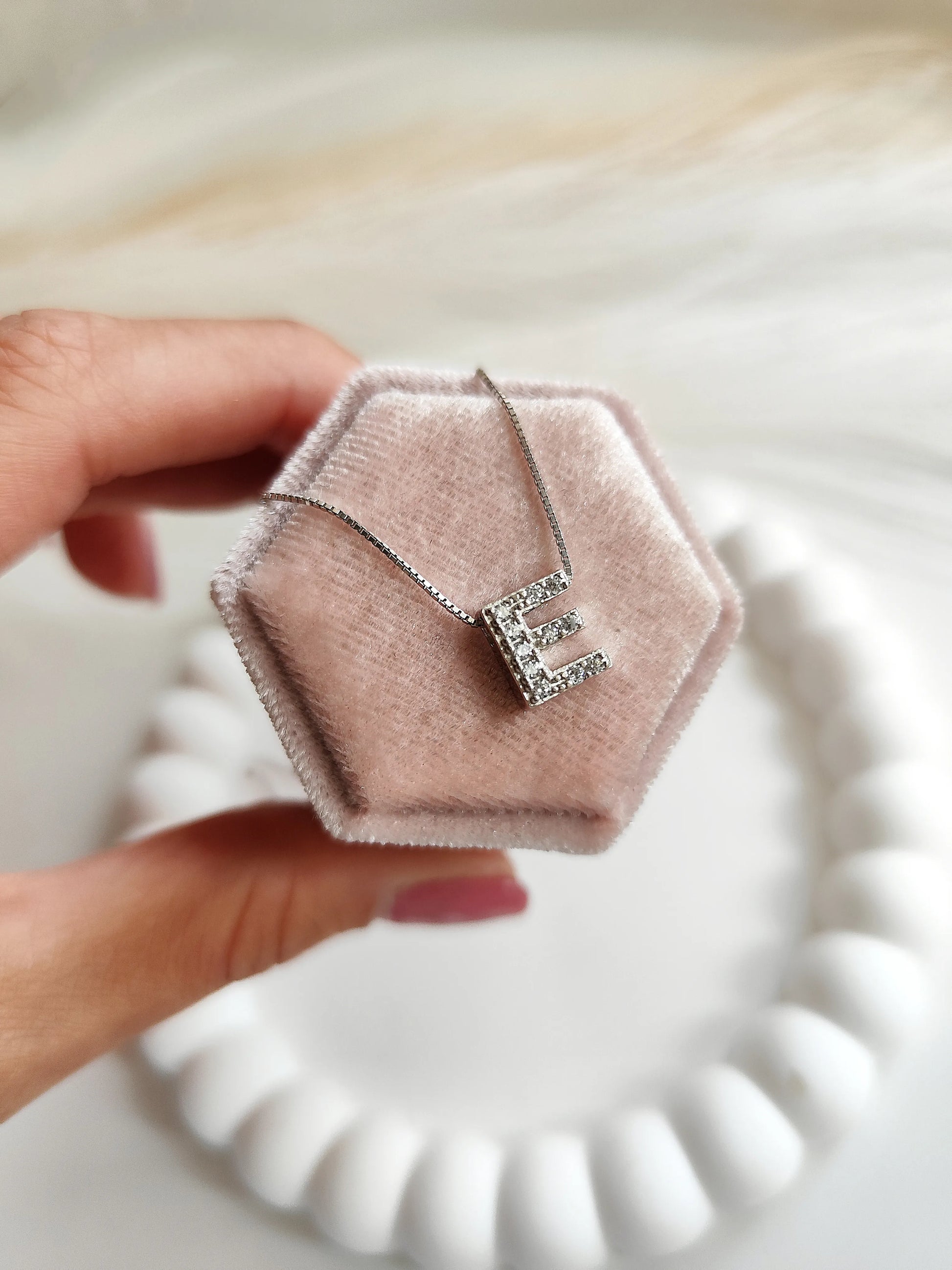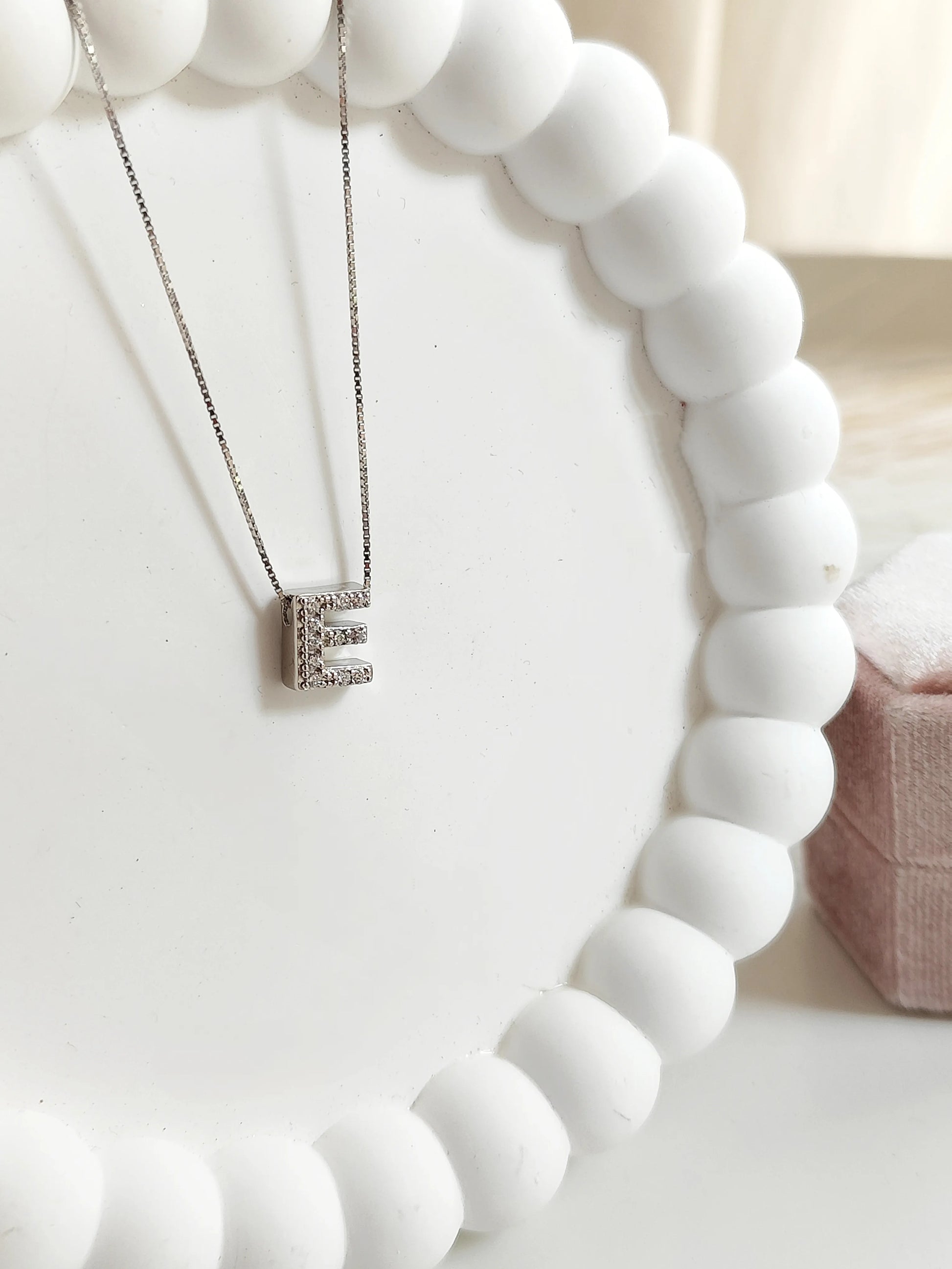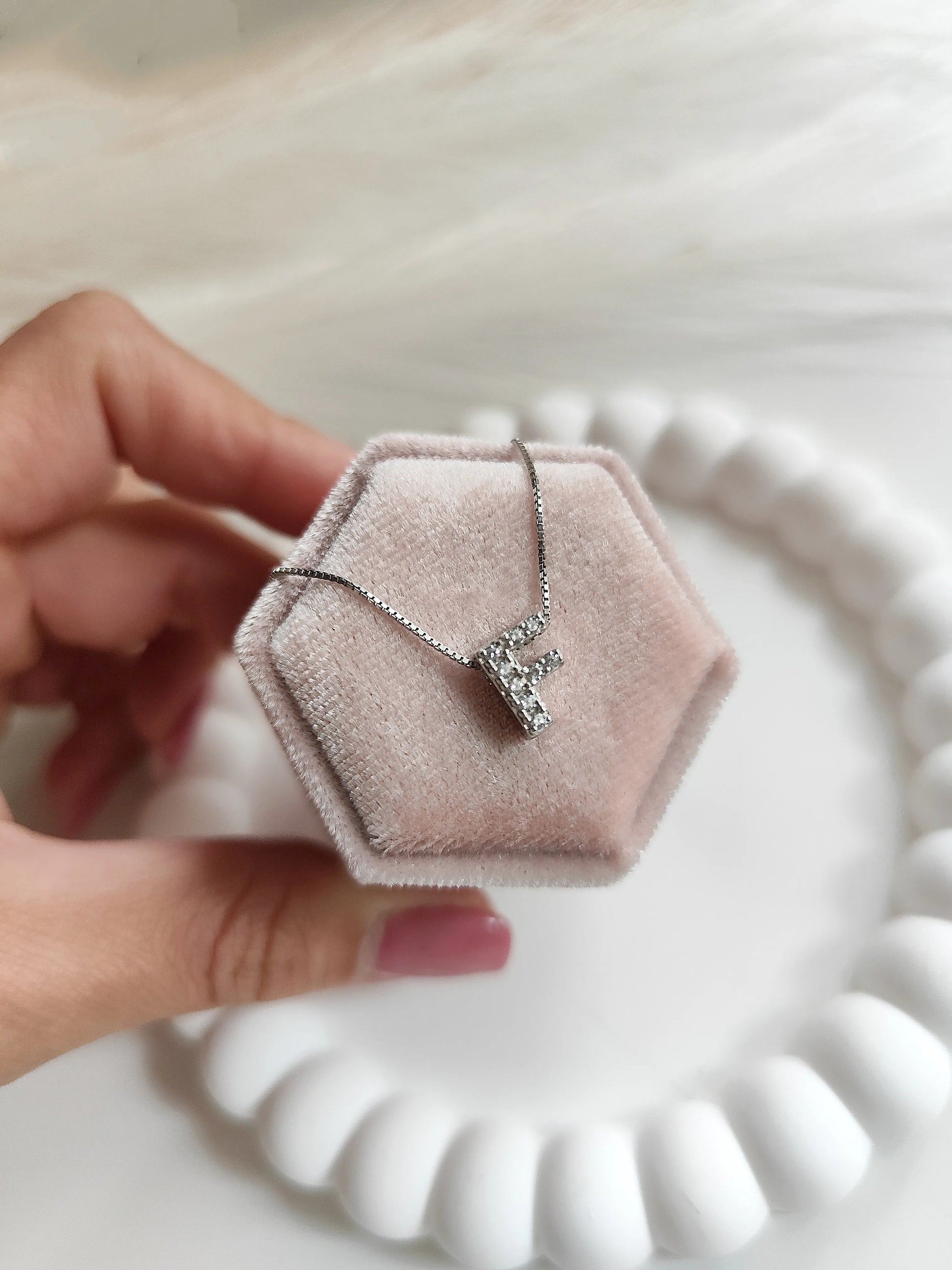 La collana con iniziale è realizzata in argento 925 e pietre zirconi.