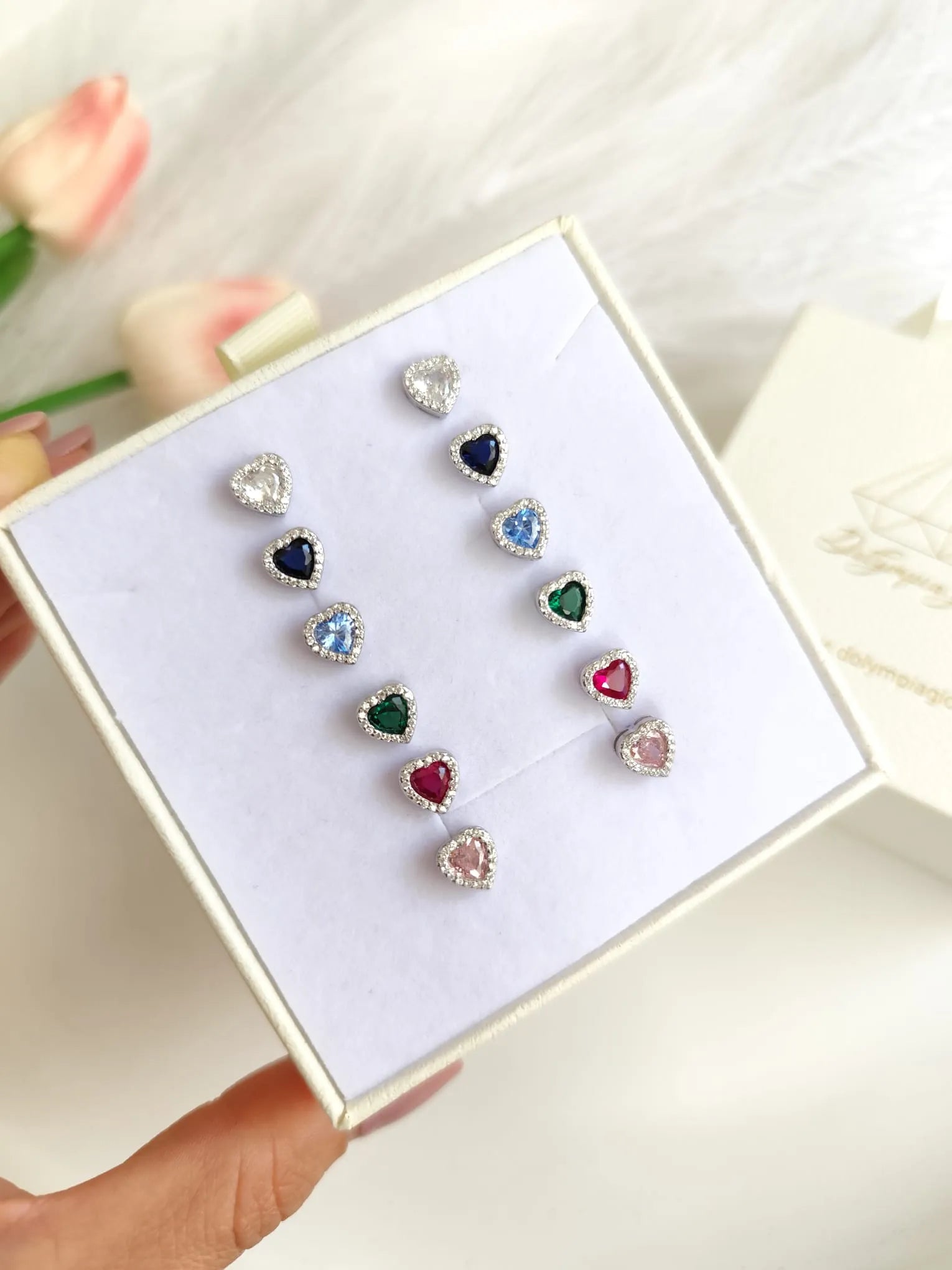 Gli Orecchini Cuore Punto Luce Piccoli, sono realizzati con una pietra centrale colorata e un contorno di zirconi bianchi.